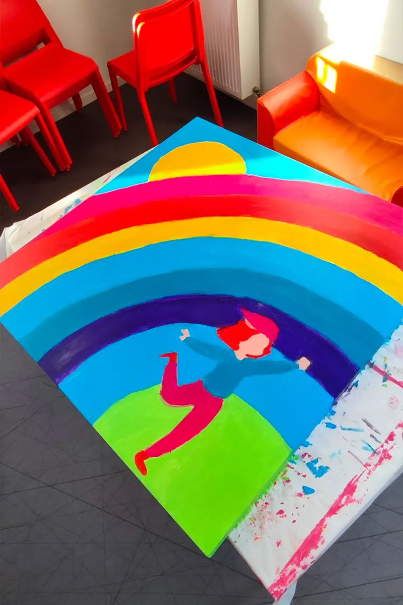 La création de l’oeuvre commence par une séance de co-création. Les jeunes de 8 à 12 ans contribuent à l’imagination des motifs et des couleurs qui composeront l’œuvre finale. Que représente pour eux la famille ?