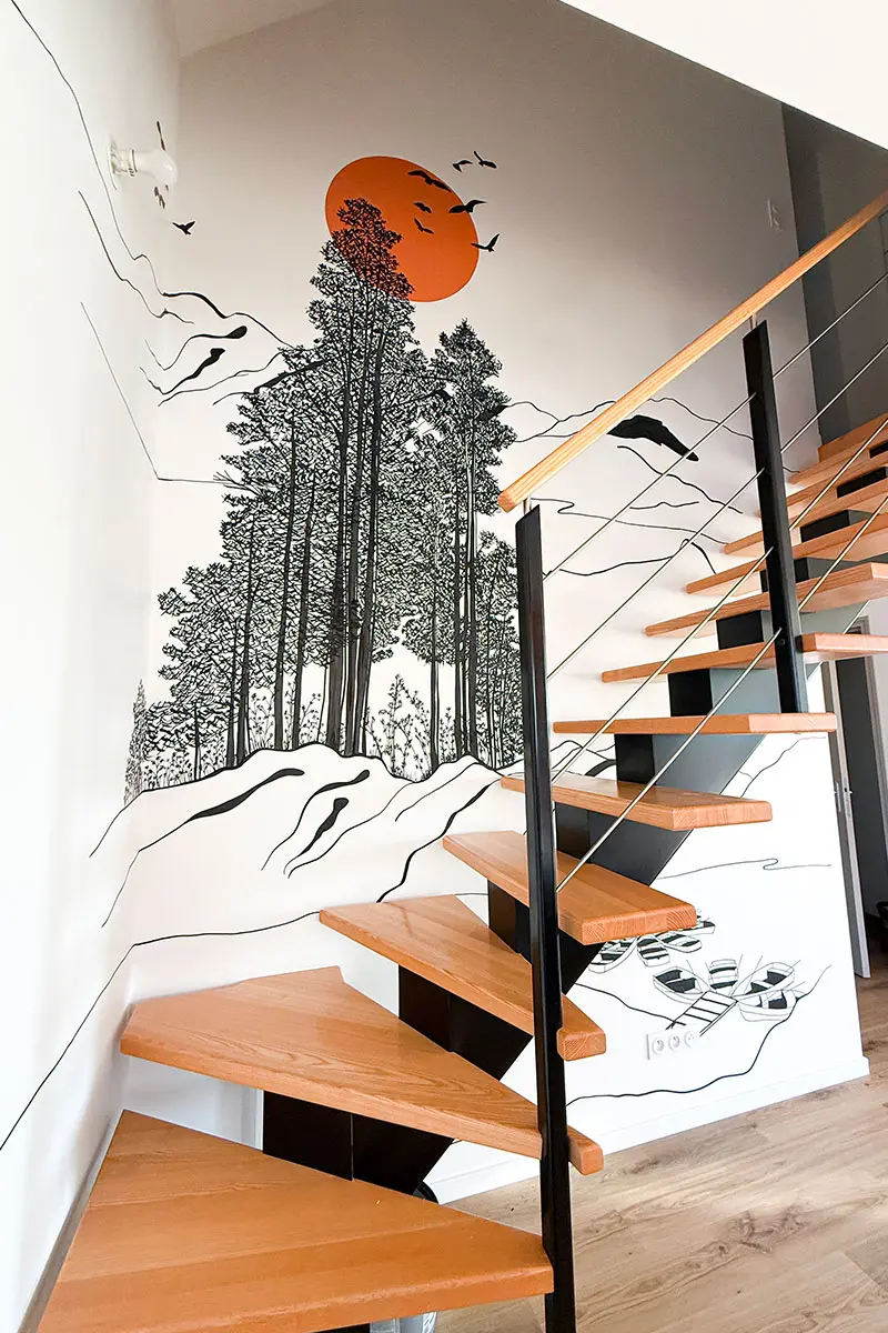 Créer une fresque dans une cage d’escalier, c’est révéler un volume, mais aussi raconter un souvenir au mur, avec sens et originalité.