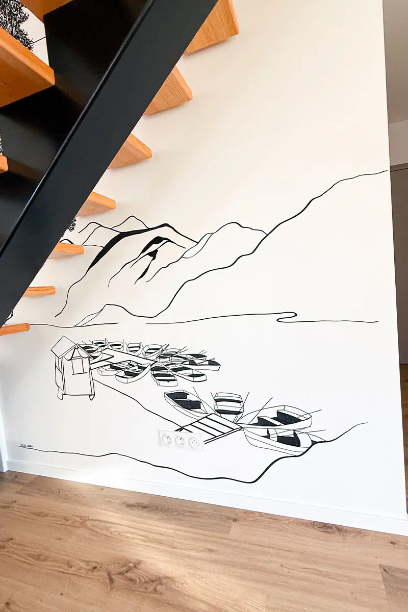 Cette approche minimaliste permet à la fresque de rester légère dans l’espace sans venir surcharger la décoration dans le salon et la salle à manger.